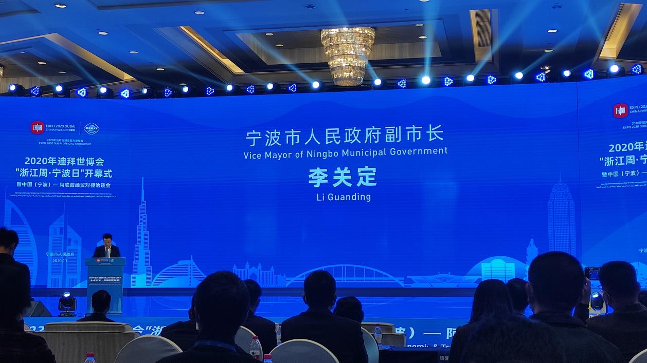 宁波市副市长李关定致辞表示,阿联酋是宁波市在阿拉伯地区投资贸易的重要对象,今年前三季度,宁波市与阿联酋进出口总额达到17亿美元,同比增长27.5%;阿联酋在宁波累计批准项目63个,实际外资6337万美元,宁波在阿联酋累计批准的境外企业和机构102个,备案(核准)中方投资额29186万美元。希望借此活动,不断加深中阿贸易协作。