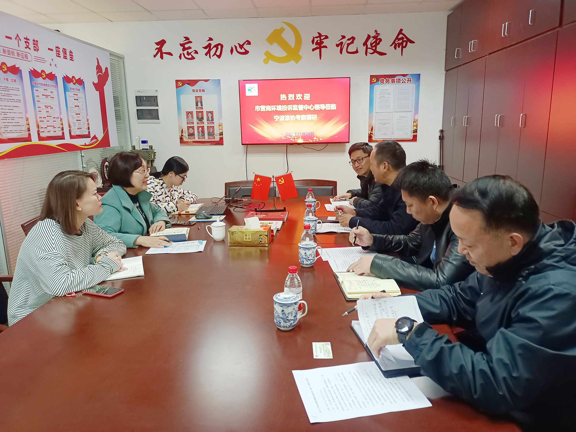为致力于当好企业健康发展的“老娘舅”,探索构建常态化、系统化、全链条、高效率的营商环境投诉举报处理体系,不断提升各类市场主体的获得感和满意度,打造更优的营商环境,反映企业在生产经营过程中的困难与心声,助力企业更快更好地发展。11月24日,在宁波市营商环境投诉监督中心王鸣涛处长的带领下,市纪委监委驻中心一级调研员胡新锁、市司法局驻中心调研员黄金顺、中心联络员屠恩波一行领导莅临宁波涂料与涂装行业协会考察调研,受到了宁波涂协吴晓明秘书长和秘书处全体成员的热烈欢迎!