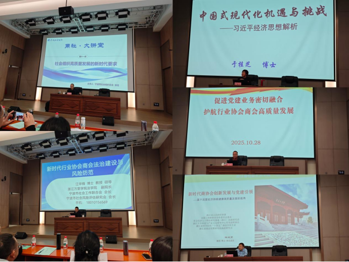 本次培训以理论为指导,坚持问题导向与实效取向,聚焦“党业融合”这一课题,着力探索将党建“软实力”转化为发展“硬支撑”的实践路径。分别邀请了宁波市社会组织总会秘书长林冬作《行业协会商会规范化建设讲解》,浙江万里学院法学院副院长江华峰作《新时代行业协会商会法治化建设与风险防控》、浙江大学宁波理工学院教授于桂芝作《中国式现代化的机遇与挑战——习近平经济思想解析》,上海市两新党建服务中心主任王文斌作《党业融合,行业协会商会如何护航高质量发展》,浙江省人民政府参事隗斌贤作《新时代商协会创新发展与党建引领》。