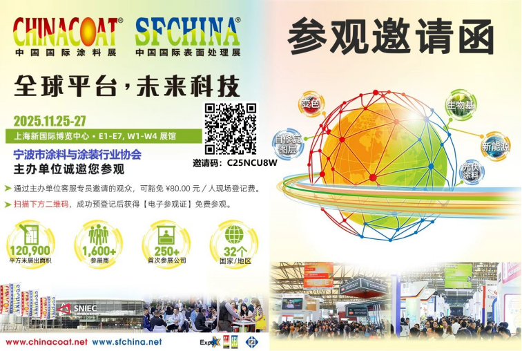 CHINACOAT中国国际涂料展览会自1996年开始服务行业,目前每年在上海和广州交替举行,一直致力为涂料行业的供应和制造商提供一个国际性展示和贸易平台,面对面接触全球、尤其是来自中国和亚洲地区的观众,2025年「中国国际涂料展 CHINACOAT」2025年11月 25-27日重临上海。本届展览会覆盖超过9个展馆(E2-E7、W1-W4),展出总毛面积超过105,100平方米,规模为历届最大。来自30个国家/地区逾1,450家参展商,将在五大展区向全球观众展示契合下游产业发展需求的创新产品与技术。展览会同期举办一系列技术交流活动,包括专题技术讲座及国家涂料业发布会,为业界人士提供分享经验、学习新知、掌握行业前沿趋势的平台。