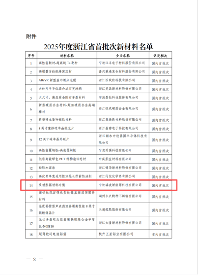 近日,浙江省经信厅正式公布 2025 年度首批次新材料认定结果,宁波市涂料与涂装行业协会理事单位——宁波瑞凌新能源科技有限公司生产的反射型辐射制冷膜跃入眼帘,获国内首批次新材料认定。这一荣誉不仅是对瑞凌在辐射制冷超材料领域创新实力的权威认可,更彰显了其产业科技成果的市场价值与行业影响力。