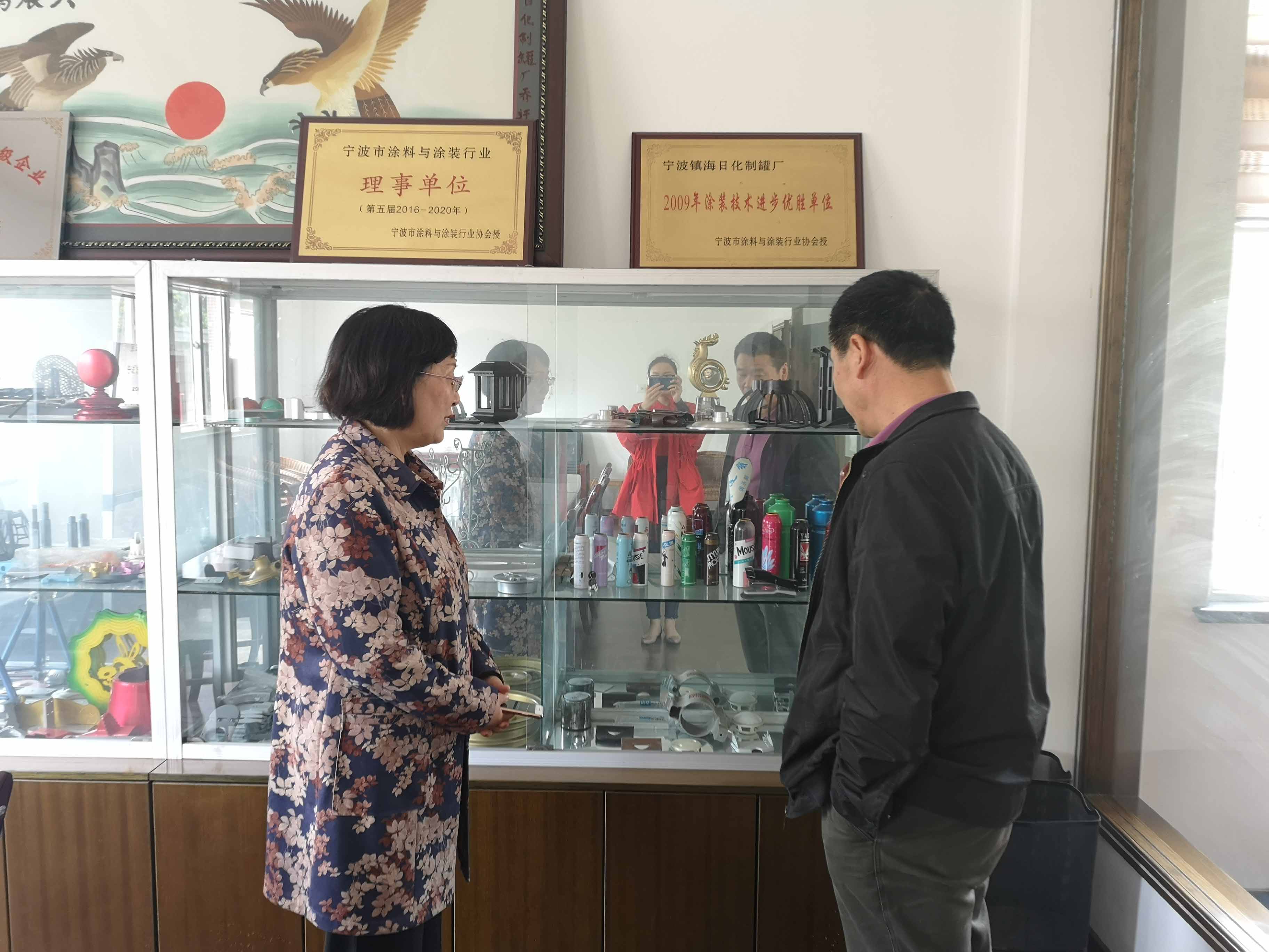 与宁波市镇海日化制罐厂张慧平厂长交流、参观生产车间和样品展示厅