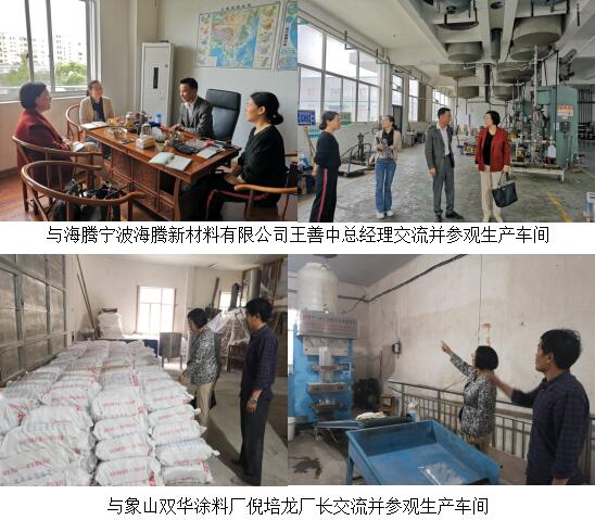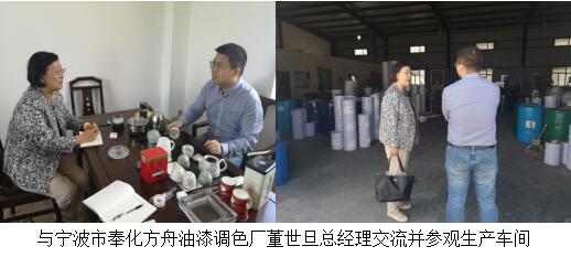 宁波涂协“走企业、深调研、促交流”系列活动持续开展,为进一步了解企业发展现状,倾听企业需求,传达国家相关政策和征求协会下步工作的意见,5月7日,宁波涂协吴晓明秘书长和王银璐副秘书长走访了象山片区的宁波海腾新材料有限公司、宁波长丰化工有限公司、象山双华涂料厂、宁波市奉化方舟油漆调色厂进行走访调研。