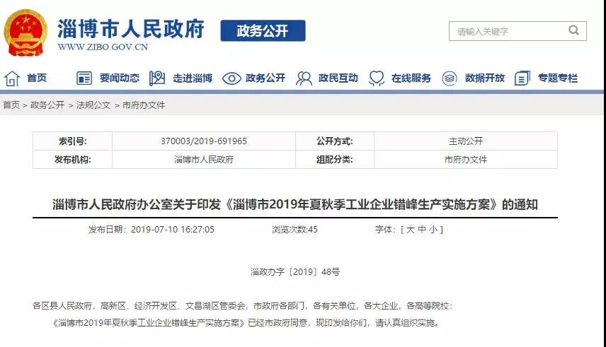 另外,在7月10日,淄博市政府办公室印发《淄博市2019年夏秋季工业企业错峰生产实施方案》的通知,宣布从7月份起开展为期3个月的夏秋季工业企业错峰生产!