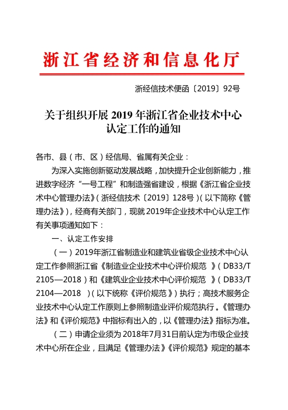 附件:省经信厅关于组织开展2019年浙江省企业技术中心认定工作的通知(浙经信技术便函〔2019〕92号)