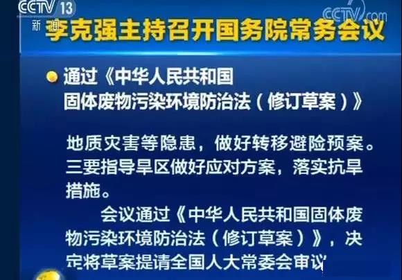 6月5日国务院常务会议,通过《中华人民共和国固体废物污染环境防治法(修订草案)》。
