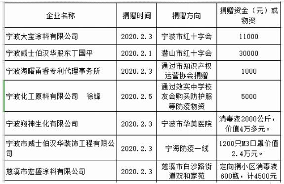 2月3日至5日,会员企业及个人通过宁波市红十字会等途径直接捐款47000元;捐赠消毒液2000多公斤、M3口罩1200个等价值70000元等物资。