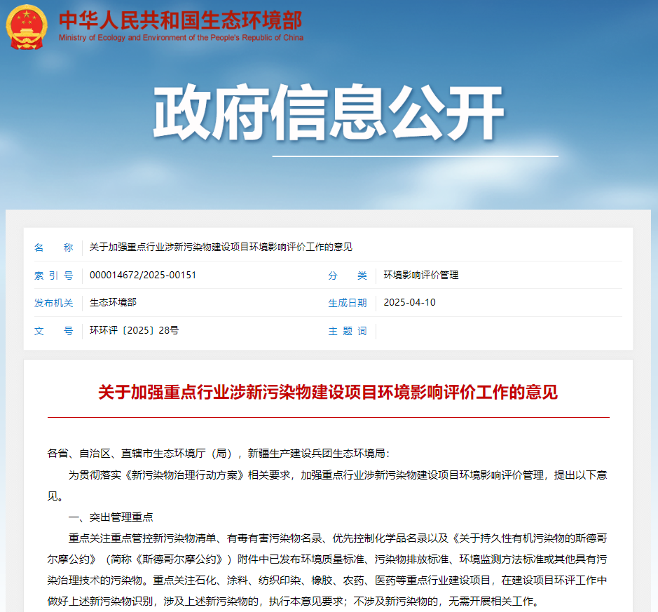 生态环境部4月10日发布的《关于加强重点行业涉新污染物建设项目环境影响评价工作的意见》(下称《意见》)提出,将评价重点放到重点行业和具备相关标准或监测方法的新污染物上,明确项目环境准入要求和评价工作要求,发挥环评源头预防、绿色引领作用。