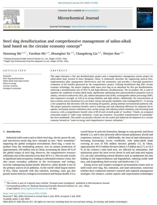 近日,宁波市涂料与涂装行业协会会员单位——宁波太极环保设备有限公司董事长史汉祥联合公司技术骨干在国际知名期刊《Microchemical Journal》上发表题为“Steel slag desulfurization and comprehensive management of saline-alkali land based on the circular economy concept”的研究论文。董事长史汉祥为第一作者及通讯作者,期刊属科睿唯安JCR分区Q1,中科院分区2区,2024年最新影响因子为5.1。
