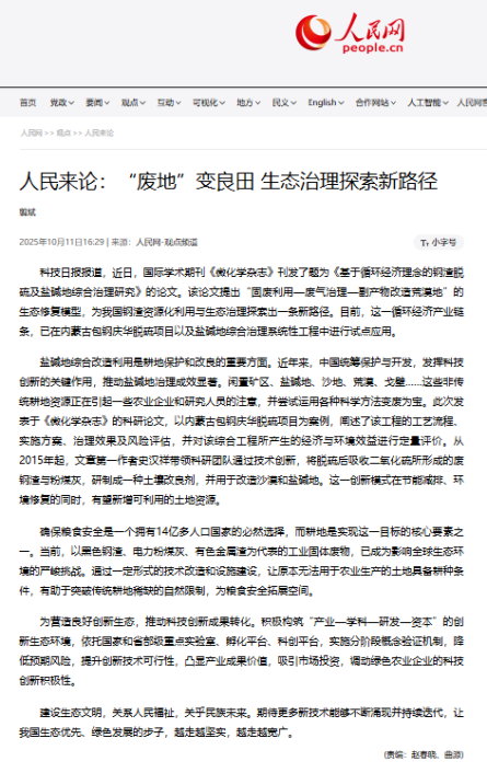 近日,人民网观点频道的人民来论栏目以《“废地”变良田 生态治理探索新路径》为题,对宁波市涂料与涂装行业协会会员单位——宁波太极环保设备有限公司董事长史汉祥发表于国际学术期刊《微化学杂志》上的论文——《基于循环经济理念的钢渣脱硫及盐碱地综合治理研究》,进行了深入报道。