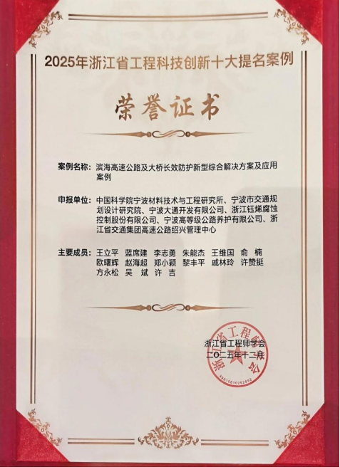 近日,由宁波市涂料与涂装行业协会常务副会长单位浙江钰烯腐蚀控制股份有限公司联合协会副会长单位中国科学院宁波材料技术与工程研究所共同申报的“滨海高速公路及大桥长效防护新型综合解决方案及应用案例”,成功入选2025年浙江省工程科技创新十大提名案例!