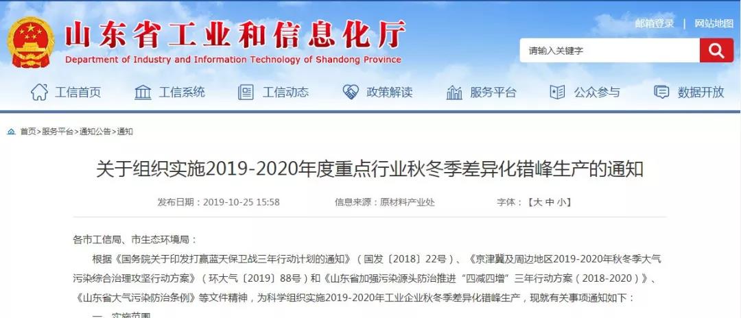 关于组织实施2019-2020年度重点行业秋冬季差异化错峰生产的通知