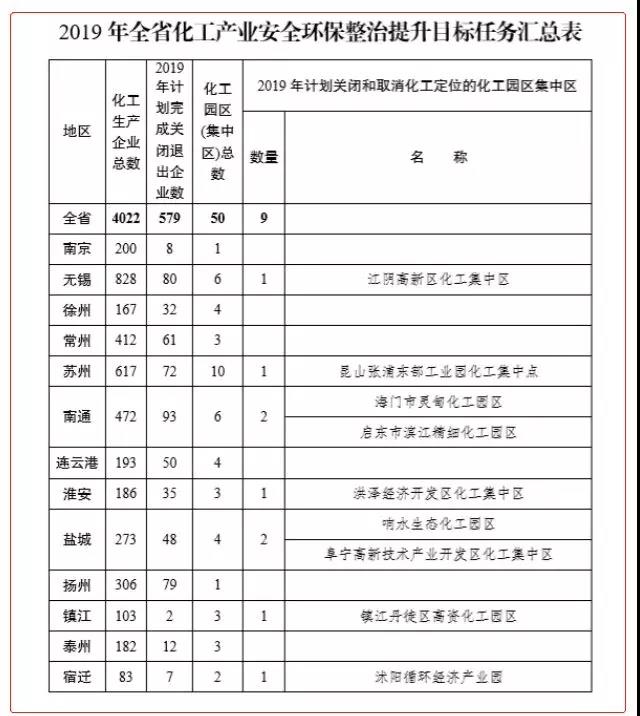据悉,江苏省是我国化工产业大省,化工产业年收入超2万亿元,全国排名第二,全省有超过6000家化工企业,53个化工园区。根据江苏出台《江苏省化工产业安全环保整治提升方案》(征求意见稿)的要求,到2020年底,江苏省化工生产企业数量减少到2000家,到2022年,全省化工生产企业数量不超过1000家;也就是说,在这两年的时间里,还将关闭5000余家化工企业。