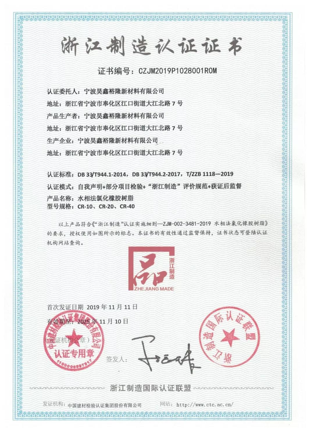 认证“浙江制造”是对昊鑫裕隆实力的强有力证明。我们将始终牢记使命,不忘初心,以诚信创新,打造符合“浙江制造”的企业品牌,将继续贯彻高标准、严要求的生产模式,不断自我规范、推进浙江制造业标准、技术、工艺、品控的提升,发力品牌建设、领跑氯化橡胶树脂涂料原材料行业的浙江制造,为进一步提升“浙江制造”的品牌影响力添砖加瓦。