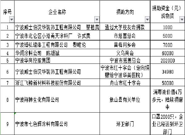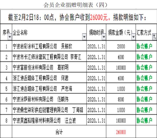 截至2月2日止,协会共收到会员个人捐款141413元;会员企业通过向宁波市红十字会等途径直行捐款36万元;捐赠消毒液价值4万多元,捐赠口罩2000个等物资。